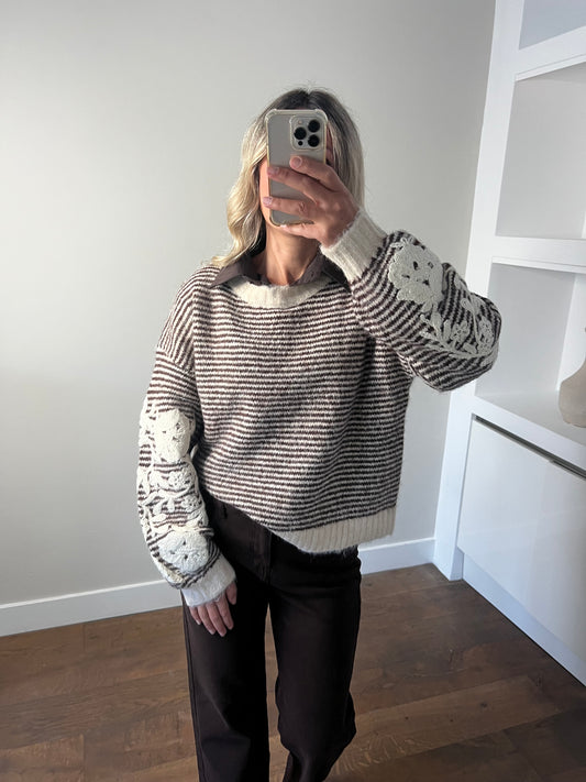 LOD Of Love - Gestreepte Trui Beige Bruin Met Geborduurde Bloemenmouw