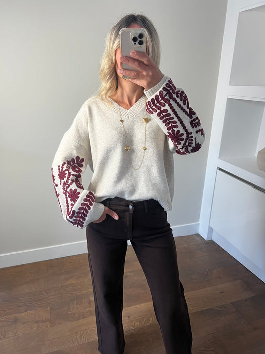LOD Of Love - Beige Gebreide Trui Met Bordeaux Bloemenprint