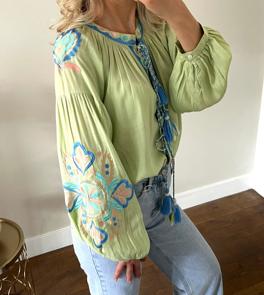 LOD of Love – Boho Bluse mit Stickerei in Zartgrün