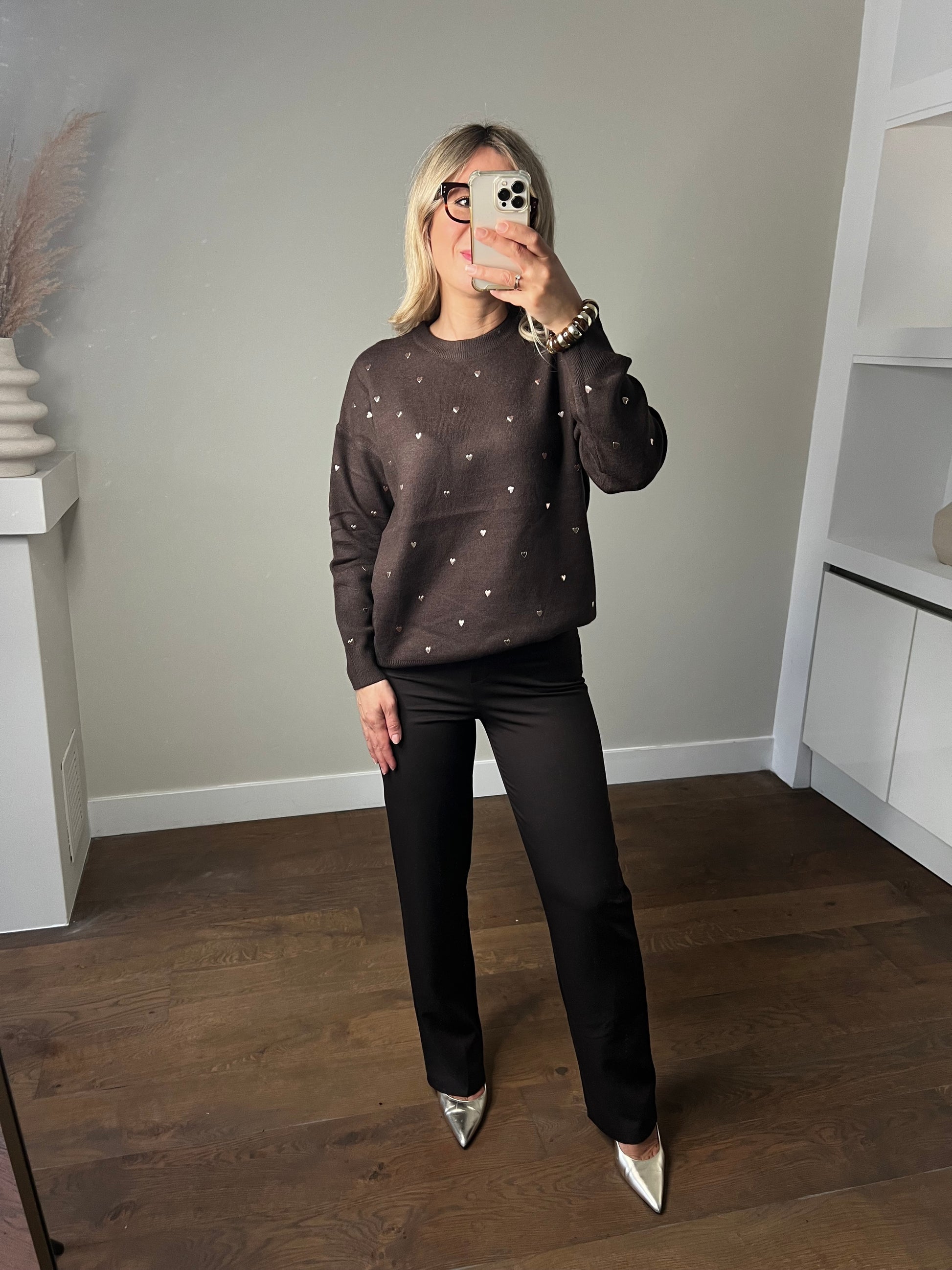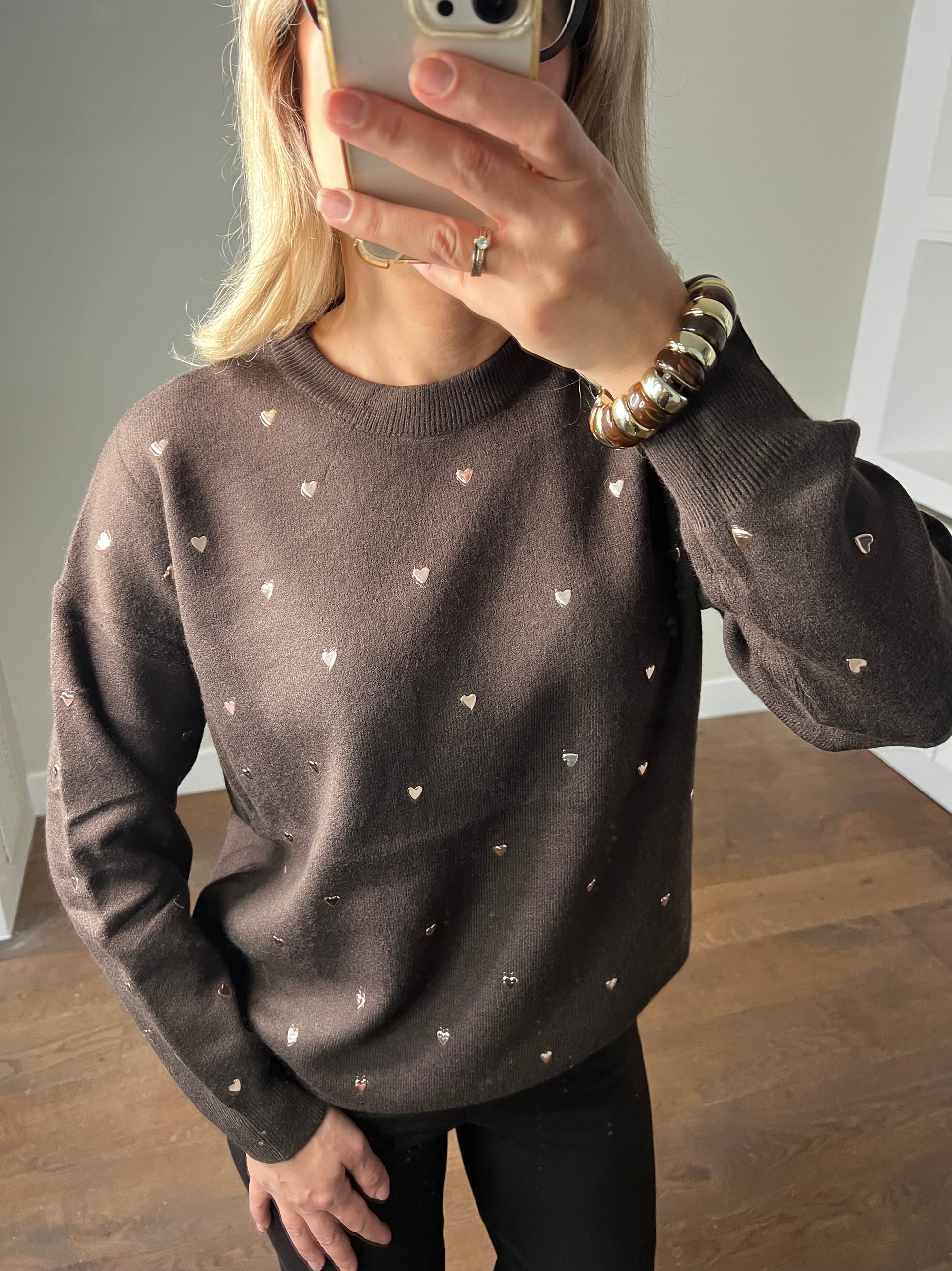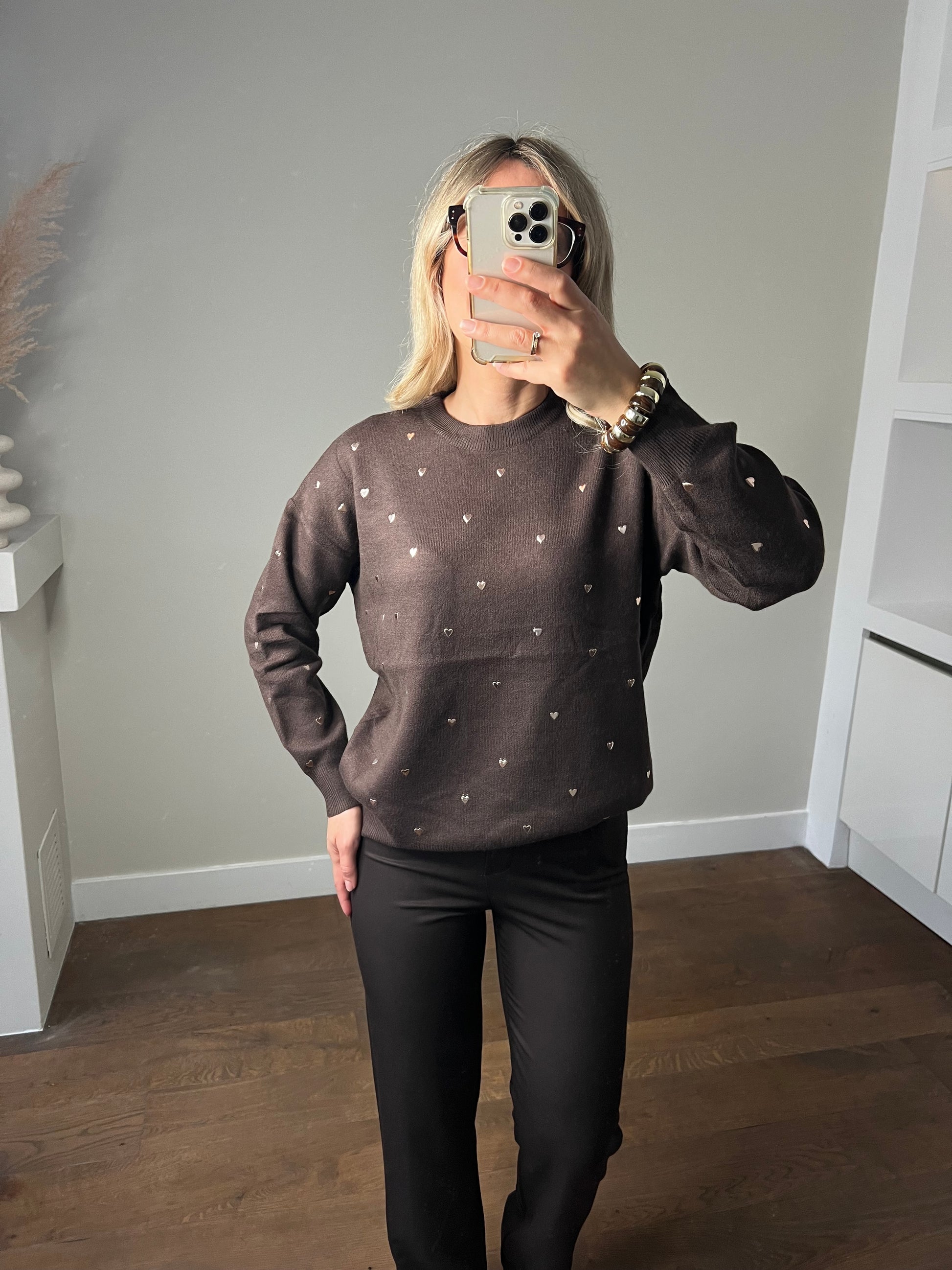 Deze warme chocoladebruine trui is niet alleen heerlijk zacht, maar ook té cute door de subtiele gouden hartjes verspreid over de stof. Perfect voor een cozy maar vrouwelijke look.