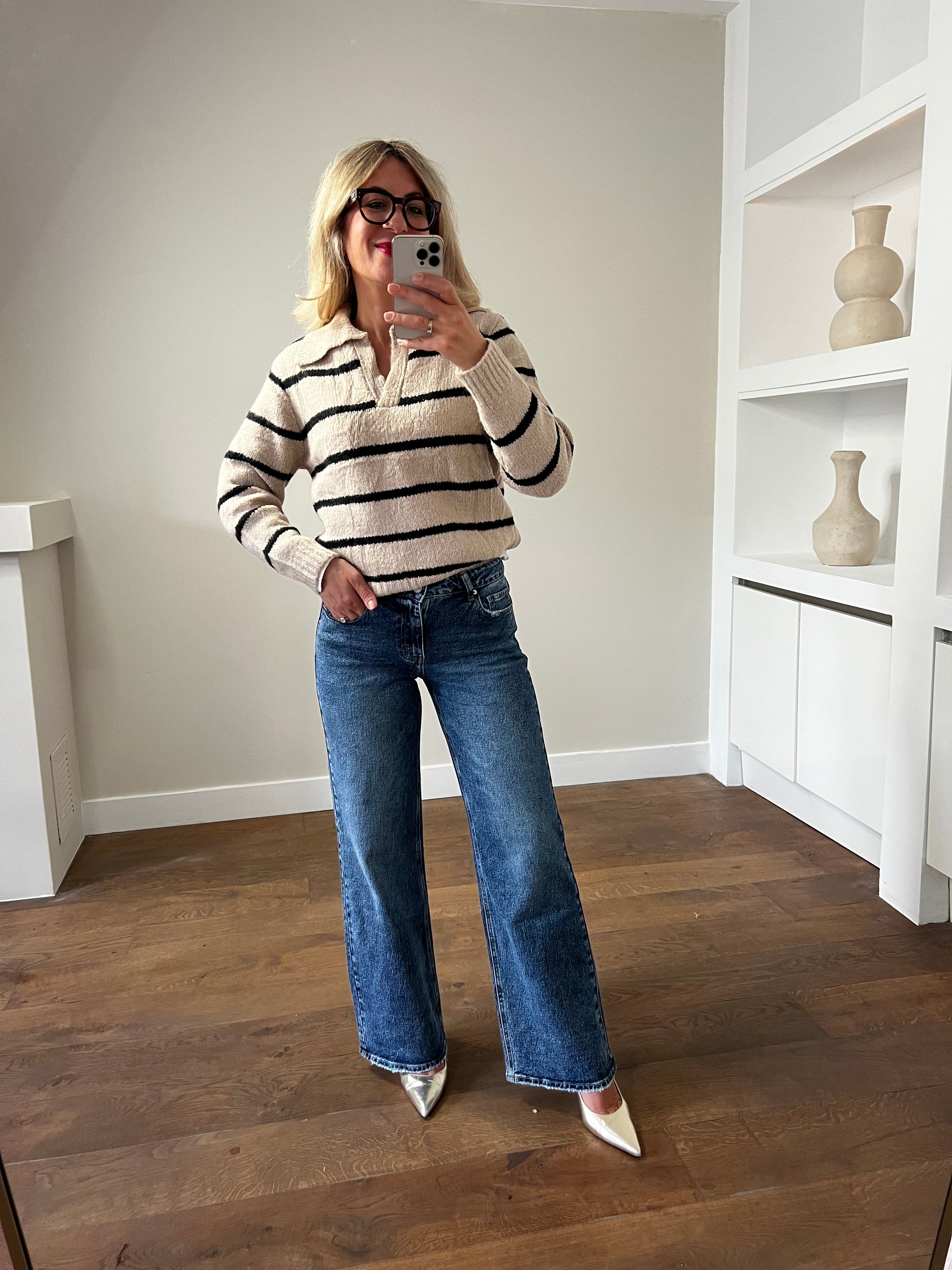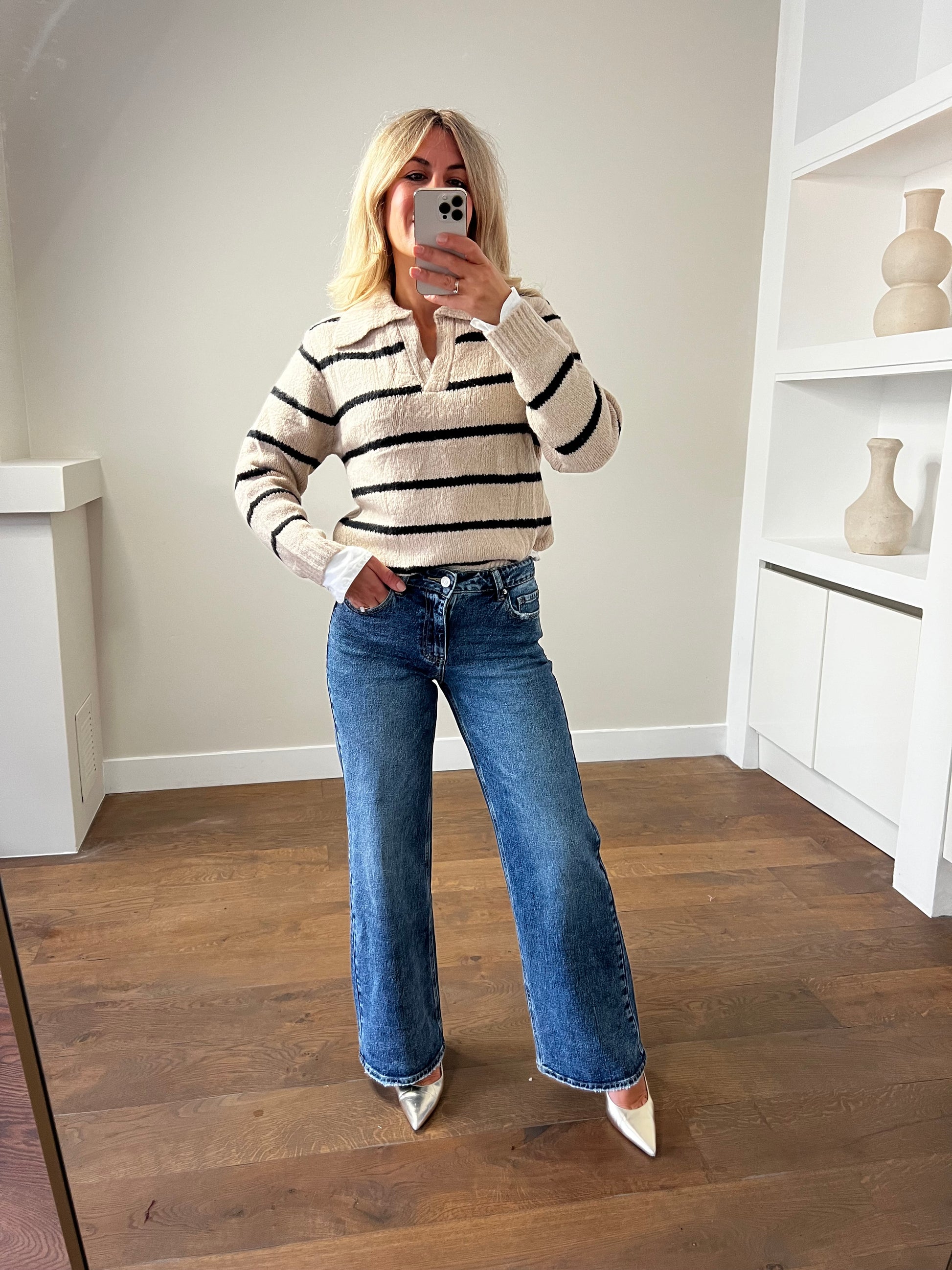 Een zachte, comfortabele trui in een beige kleur met zwarte strepen en een elegante polokraag. De relaxte pasvorm en subtiele splitjes aan de zijkant maken deze trui perfect voor een casual-chique look. Combineer met een jeans voor een effortless outfit, of draag hem over een rok voor een meer vrouwelijke touch.