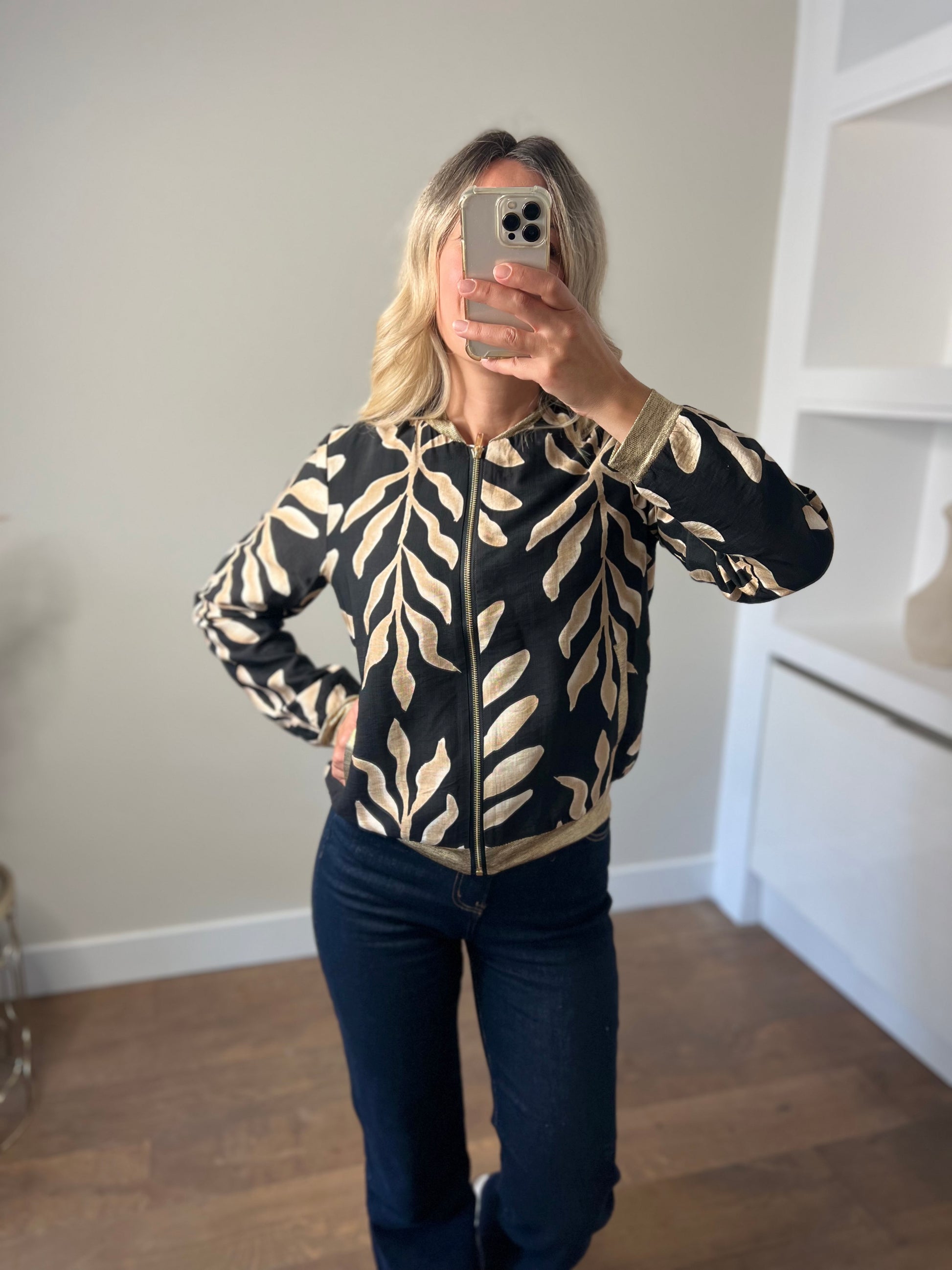 Het Bomberjack Midnight Leaf is een echte blikvanger. De diepe zwarte basis gecombineerd met de subtiele bladprint in beige zorgt voor een elegante en toch stoere uitstraling. De gouden details langs de boorden en rits maken het jasje helemaal af en geven een luxe touch.