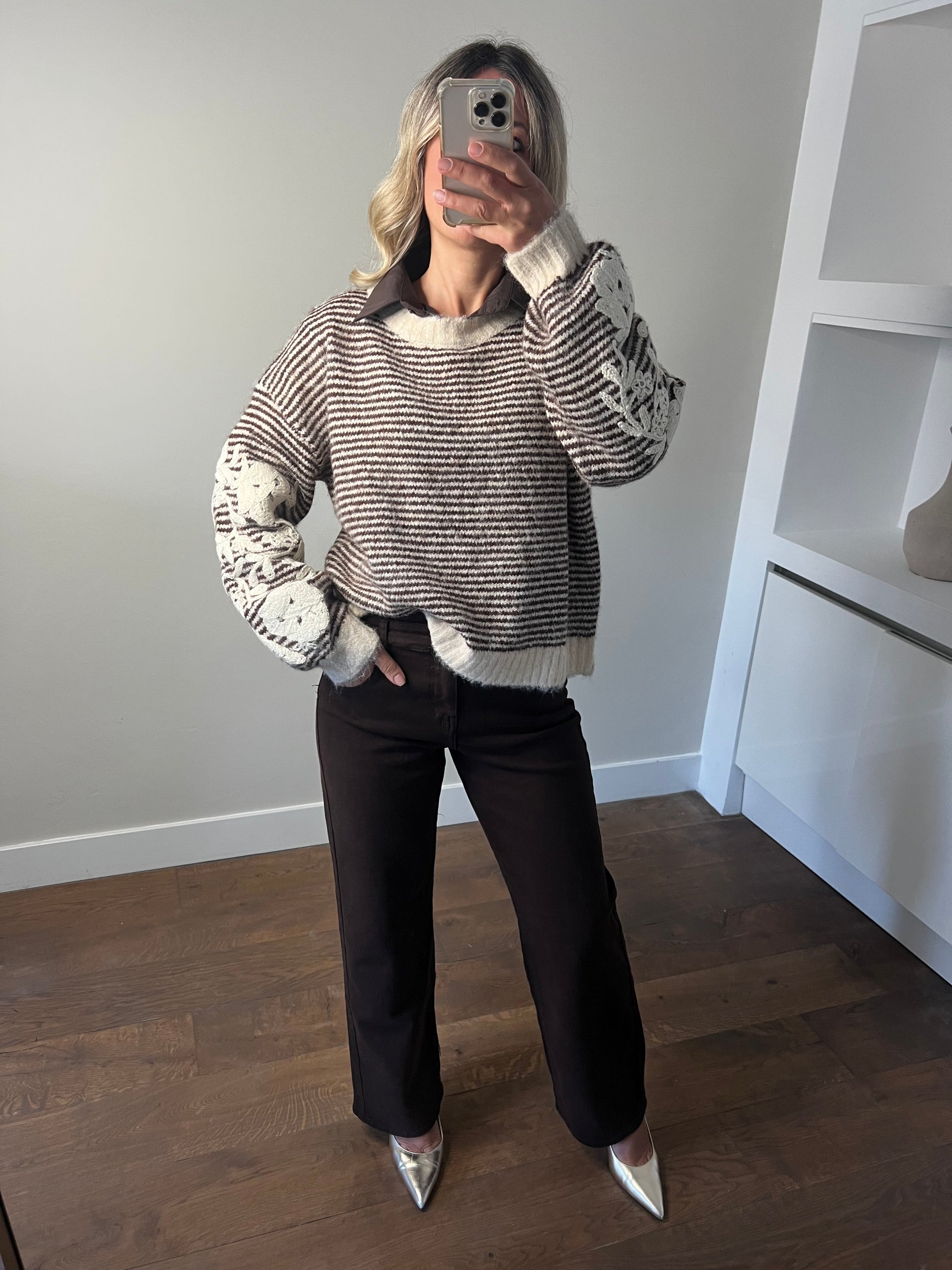 LOD Of Love - Gestreepte Trui Beige Bruin Met Geborduurde Bloemenmouw