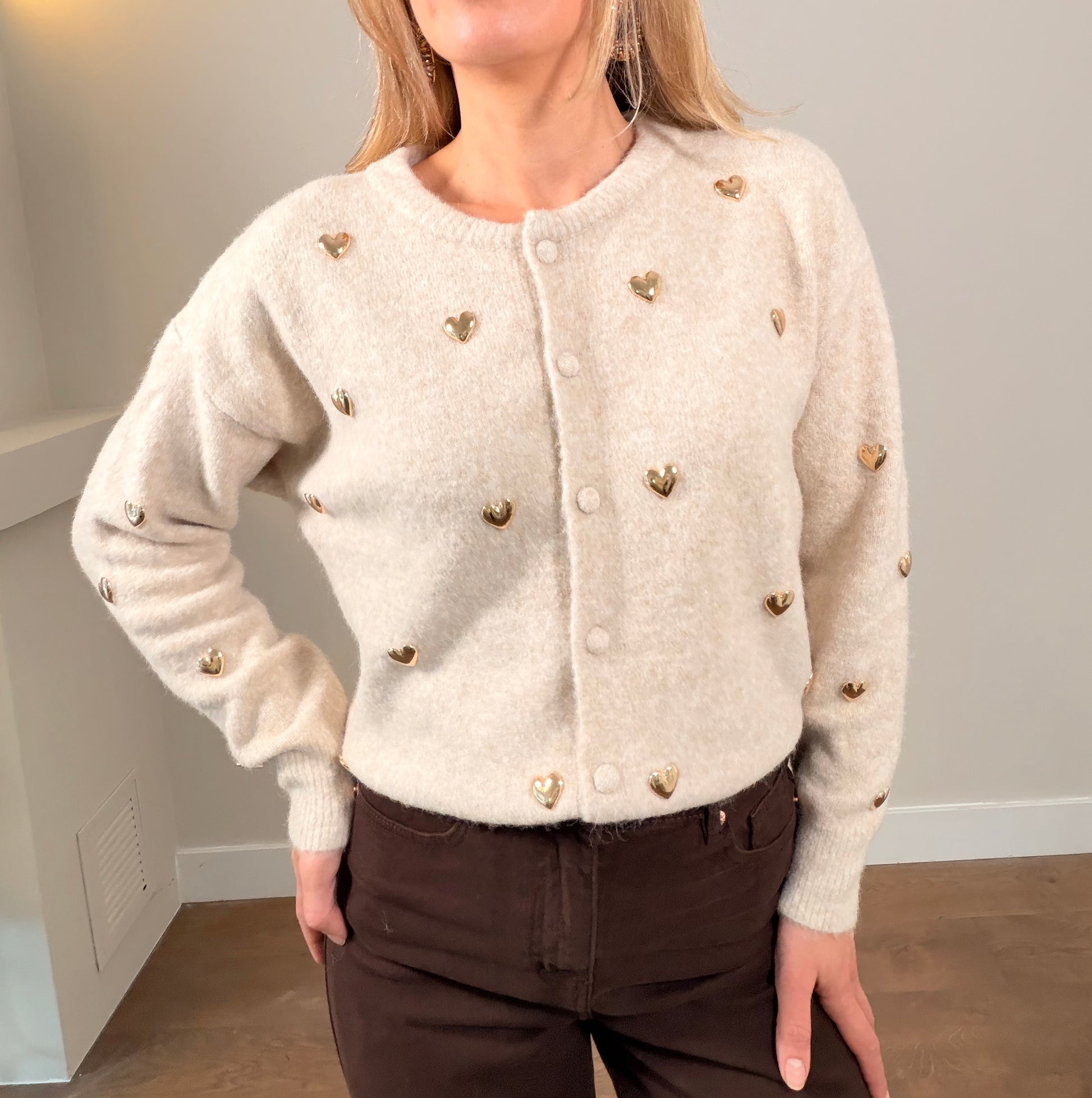 Voeg een speelse én chique touch toe aan je outfit met dit zachte, fluffy vest vol subtiele glans. De gouden hartjes geven een romantisch accent aan het rijke Taupe breisel. Draag 'm open over een top of dicht als statement knit.