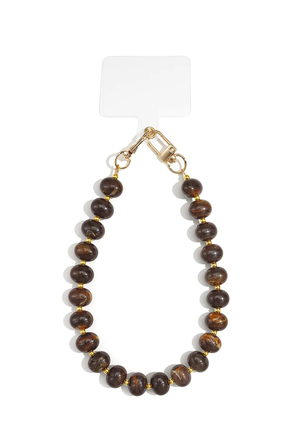 Een stijlvolle en functionele accessoire voor je telefoon! Deze phone cord is gemaakt van donkerbruine kralen met subtiele goudkleurige accenten en een stevige gouden haaksluiting. Ideaal om je telefoon veilig én fashionable bij je te dragen.