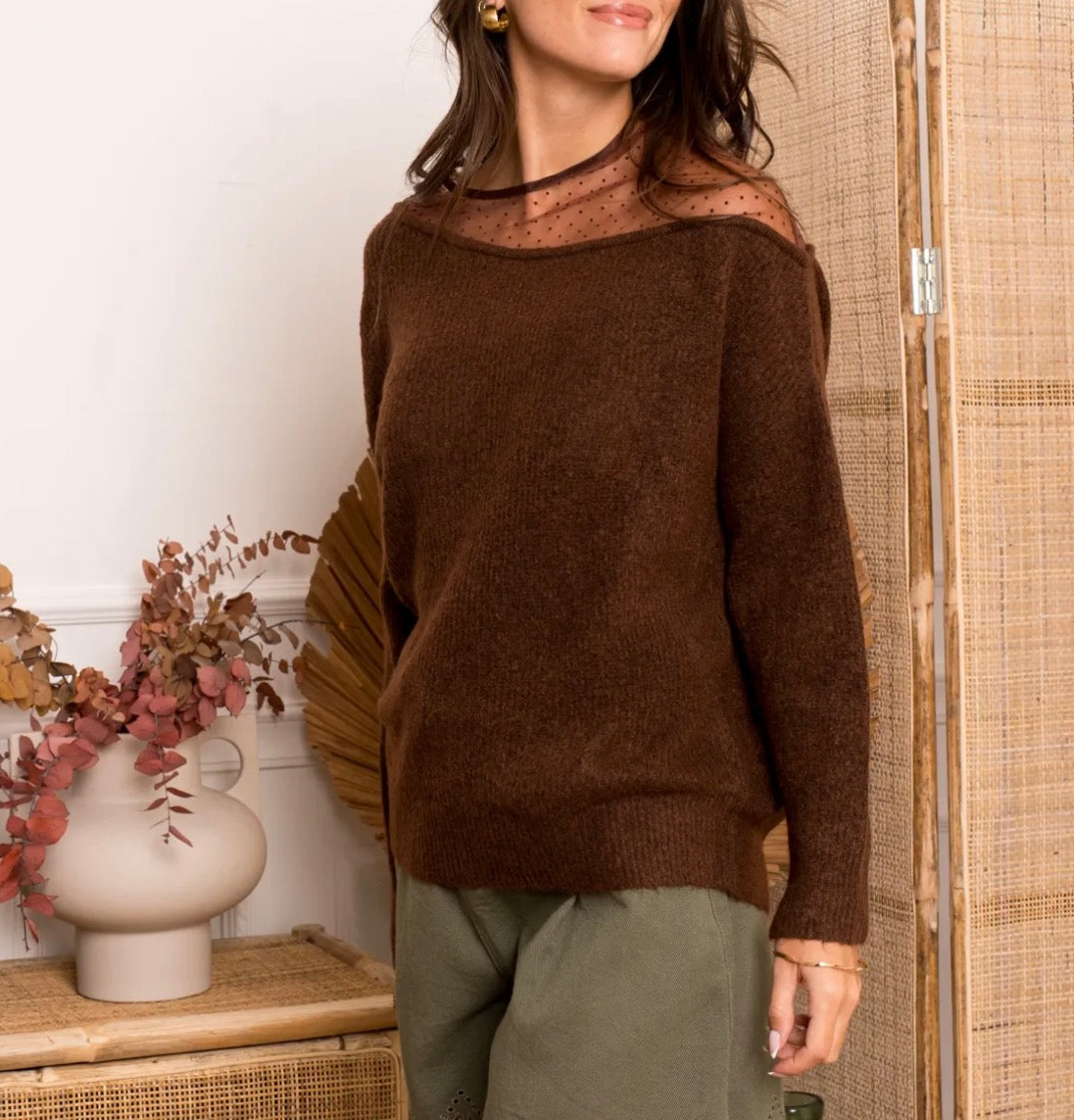 Een vrouwelijke, elegante trui met een speelse twist. De ronde hals is afgewerkt met een fijn doorschijnend mesh detail met stipjes, wat zorgt voor een subtiel en stijlvol effect.