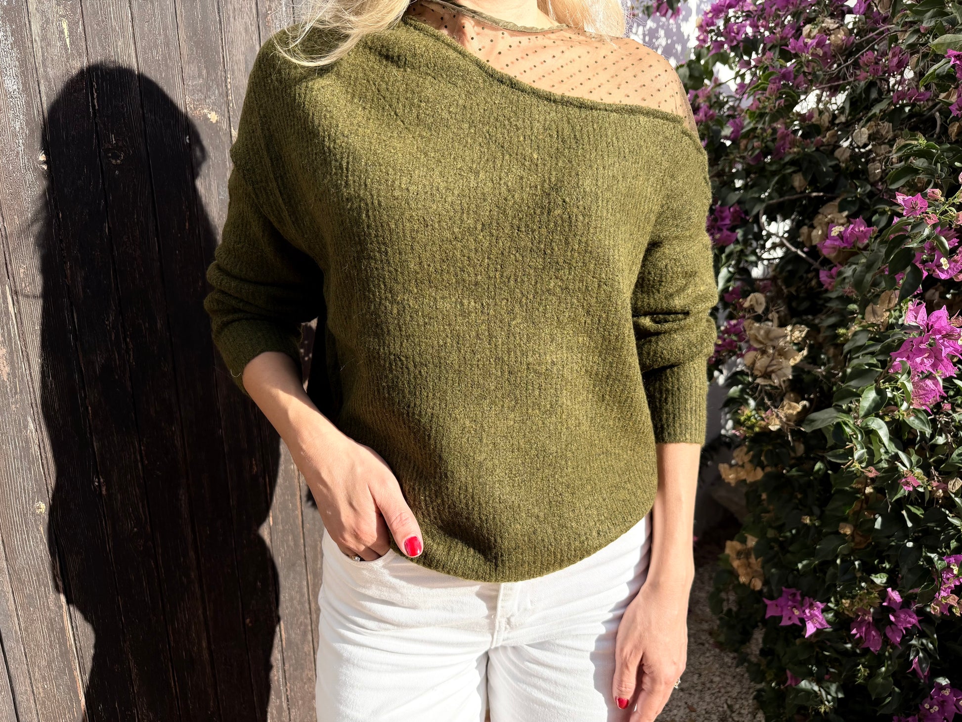 Een vrouwelijke, elegante trui met een speelse twist. De ronde hals is afgewerkt met een fijn doorschijnend mesh detail met stipjes, wat zorgt voor een subtiel en stijlvol effect.