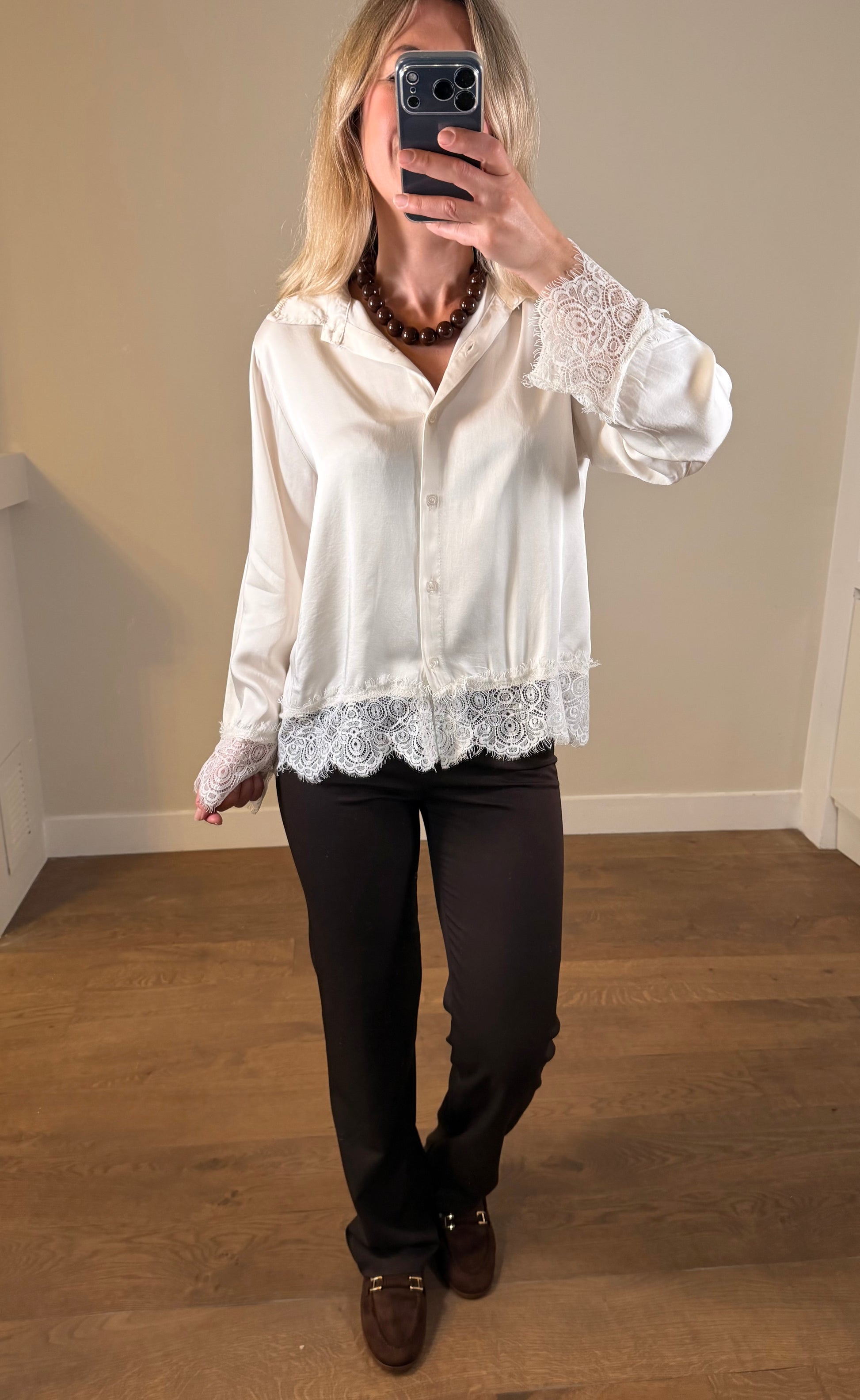 Een vrouwelijke en verfijnde blouse in een zachte offwhite kleur. Gemaakt van een luxe mix van viscose en zijde, waardoor de stof soepel valt en licht aanvoelt. De blouse is afgewerkt met elegante kanten details aan de mouwen en onderkant — perfect om te combineren met een mooie trui of vest, waarbij het kant speels onderuit piept.